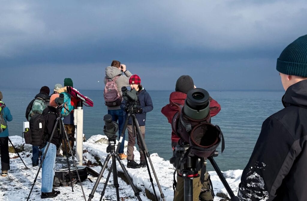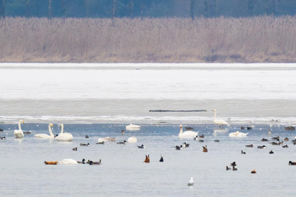 Zum Schluss ging es noch ins Ermatinger Becken, in dem viele Wasservögel überwintern. Durch das Eis, das auf einem Teil des Sees lag, waren die Vögel nicht mehr ganz so weit entfernt. Im nahen Schilf zeigte sich eine Wasserralle wunderschön bei der Nahrungssuche. In der Seemitte schwammen etwa 150 Singschwäne sowie Hunderte Spiess- und Löffelenten. In der Ferne, am Eisrand, konnten sogar drei Zwergschwäne aus dem hohen Norden beobachtet werden.