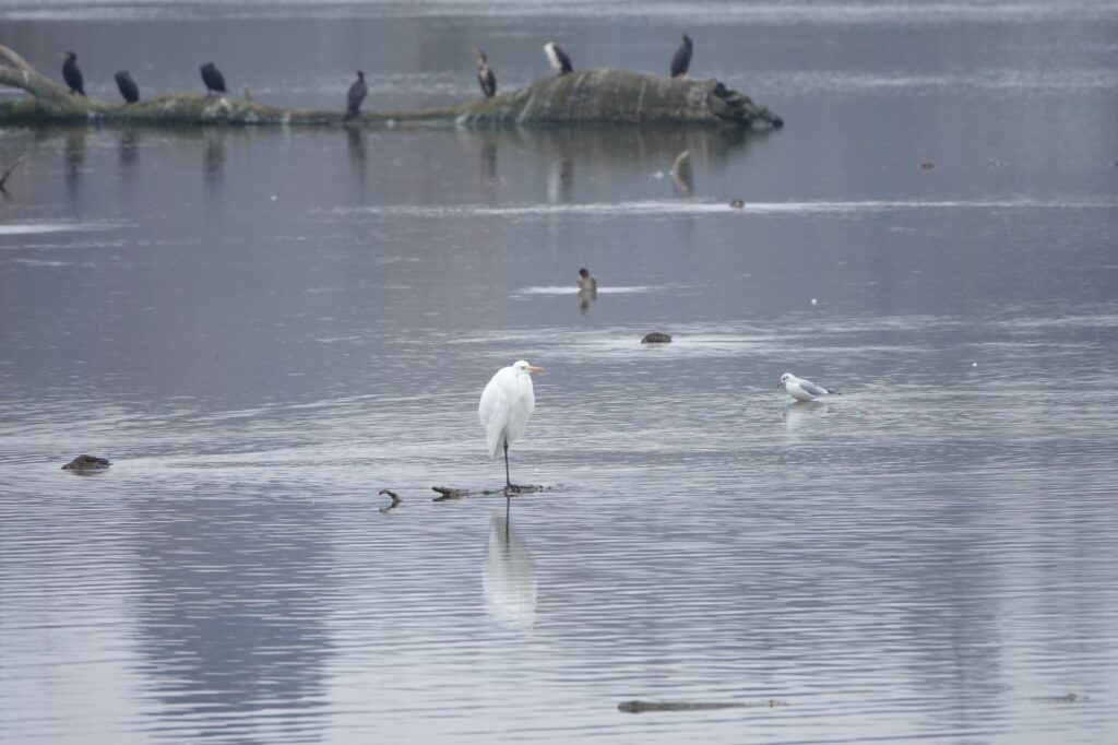 Nach unserer Ankunft verweilten wir einen kurzen Moment am Bahnhof, um unsere Ausrüstungen hervorzuholen, gingen aber bald weiter Richtung Stausee und hatten schon bald die Ferngläser aufs Schilf gerichtet, in der Suche nach seinen hinterlistigen Bewohnern. Eine kurze Sichtung einer Rohrdommel, die einen Augenblick lang beim kurzen Flug zwischen zwei Verstecken erschien, sorgte kurz für Aufregung. Vom Turm aus gab es einiges zu sehen und wir hielten uns lange dort auf. Unter anderem konnte man in der Ferne schon den einen oder anderen Flamingo erkennen (eine Gruppe dieser rastete bereits seit mehreren Monaten am Stausee). Ausserdem hörten wir Bartmeisen, sahen viele Eisvögel und beobachteten Limikolen wie Bekassinen, Flussuferläufer, Kiebitz und Grosse Brachvögel.